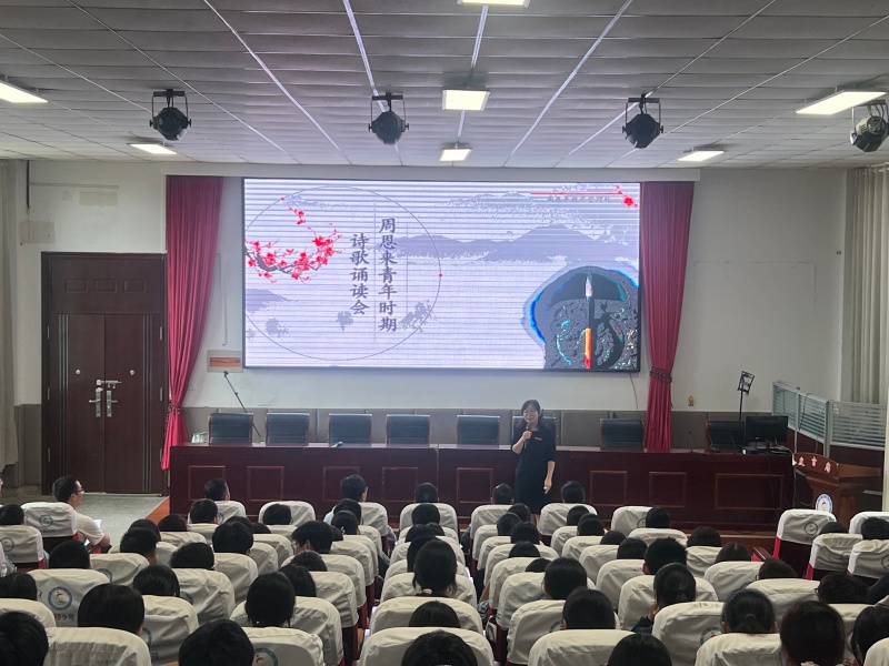 下午2时30分,诗歌诵读会在学校阶梯教室拉开帷幕。周恩来故居宣讲团成员张翔雯以“青年周恩来的诗意与信仰”为主题,为师生带来一场声情并茂的宣讲。她带领同学们共同诵读了《春日偶成》《大江歌罢掉头东》《雨中岚山》等周恩来青年时期的代表诗作,结合时代背景与诗歌内涵,生动阐释了青年周恩来为国家前途、民族命运不懈求索的坚定志向与博大胸怀。