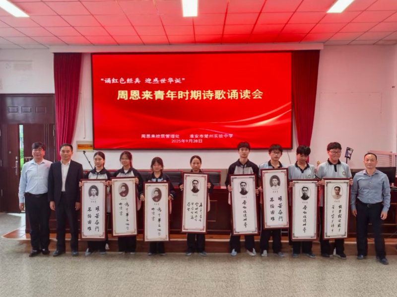 为庆祝中华人民共和国成立76周年,深入学习贯彻习近平总书记关于“大思政课”与青少年成长的重要论述精神,弘扬周恩来同志的崇高品格与家国情怀,9月28日下午,周恩来故居管理处联合淮安市楚州实验中学,共同举办“周恩来青年时期诗歌诵读会”。周恩来故居管理处主任李子权、副主任陈国冠,楚州实验中学校长徐小明以及近300名师生代表共同参加此次活动。