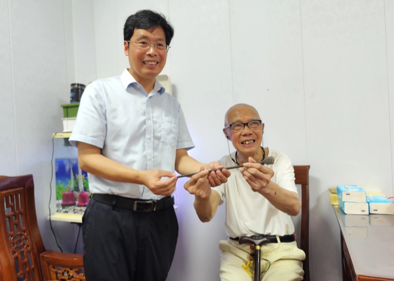 图为沙俊生(右)向周恩来纪念地管理局副局长施春生(左)交接牛角爪杖